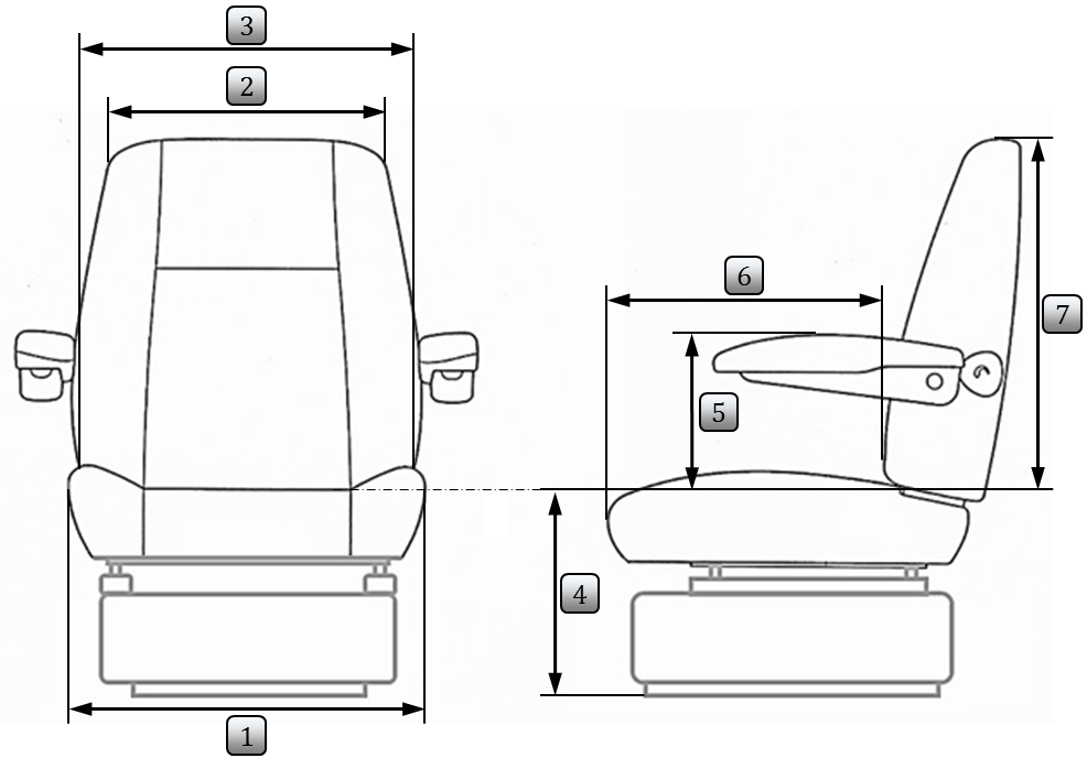 Figure 2. Studied seat dimensions: 1. Seat width, 2. Upper backrest width, 3. Lower backrest width, 4. Seat height, 5. Armrest height, 6. Seat depth, 7. Backrest height